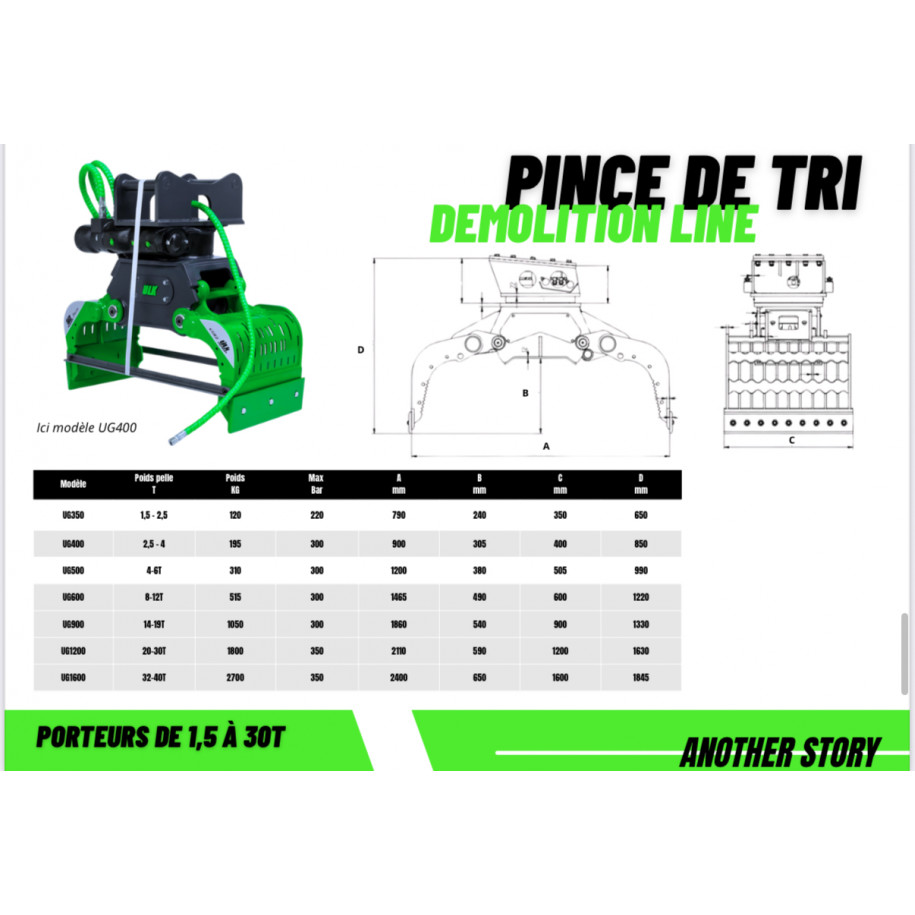 La pince de tri UG350 permet la prise, le déplacement, le tri et le positionnement précis de matériaux de différentes natures (gravats, pierre, bois, déchets). Elle est équipée d’un système de rotation hydraulique permettant une orientation continue de l’outil sans déplacement de l’engin porteur.